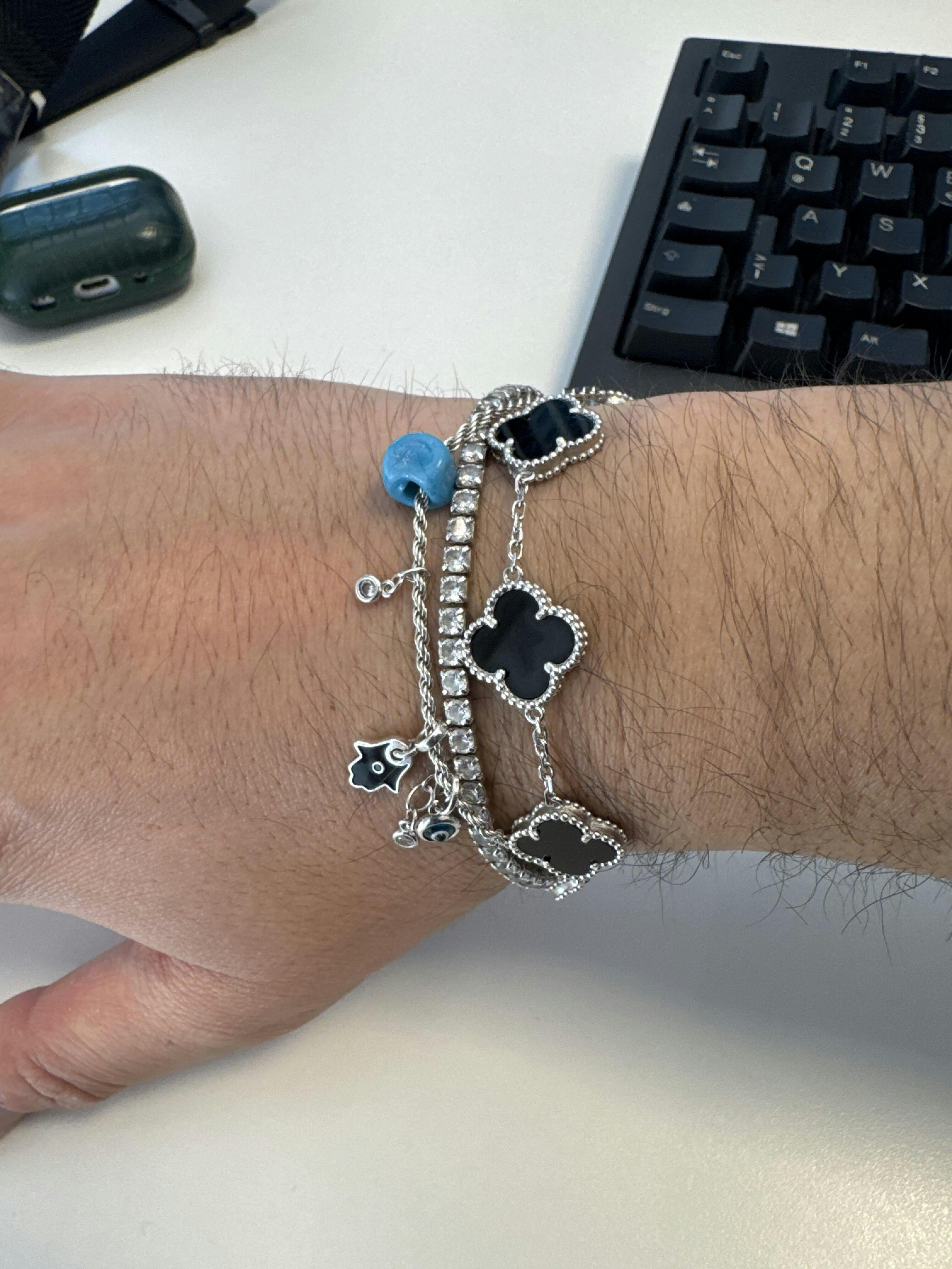 Verleihen Sie Ihrem Look einen Hauch von Eleganz und Glück mit diesem wunderschönen Damenarmband aus hochwertigem 925er Silber in edlem Schwarz. Die filigranen Kleeblatt-Anhänger symbolisieren Glück und Wohlstand, während das zeitlose Design Ihr Handgelenk perfekt zur Geltung bringt.